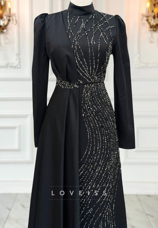 High Neck Long Sleeves Beaded Embroidery Sheath Evening Dress