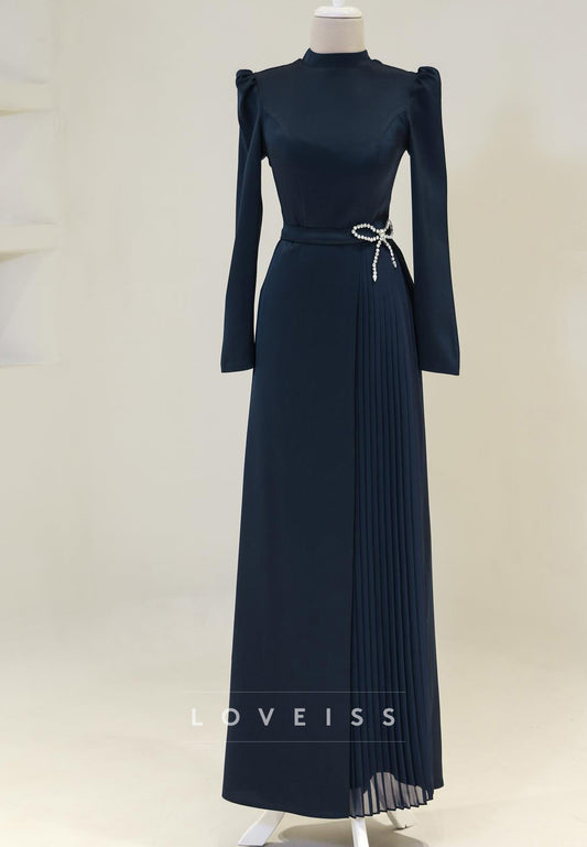 High Neck Long Sleeves Pleated A-Line Mother of Bride Dress