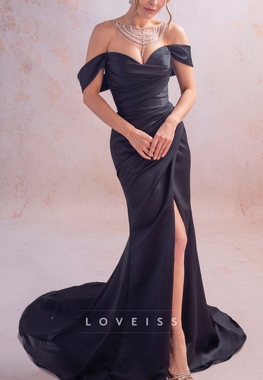 Off-Shoulder Side Slit Pleated Satin Sheath Black Wedding Dress