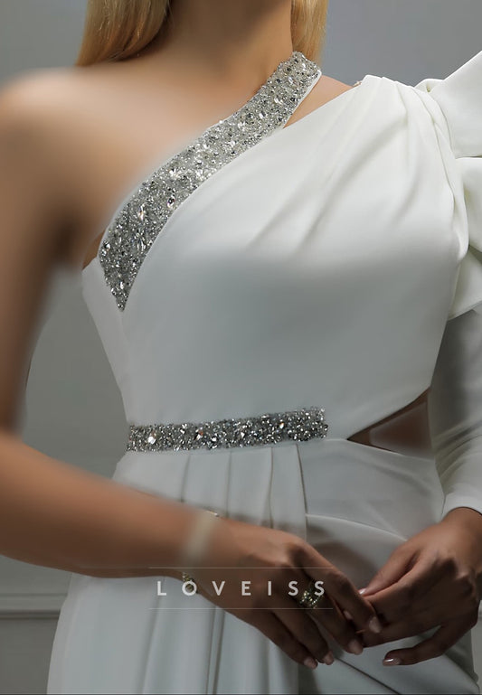One Shoulder Long Sleeves Ruffles Beaded Sheath Mother of Bride Dress