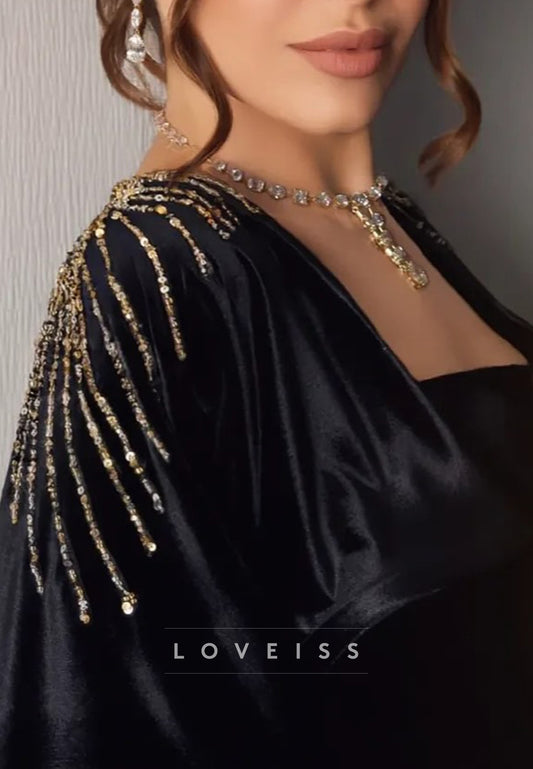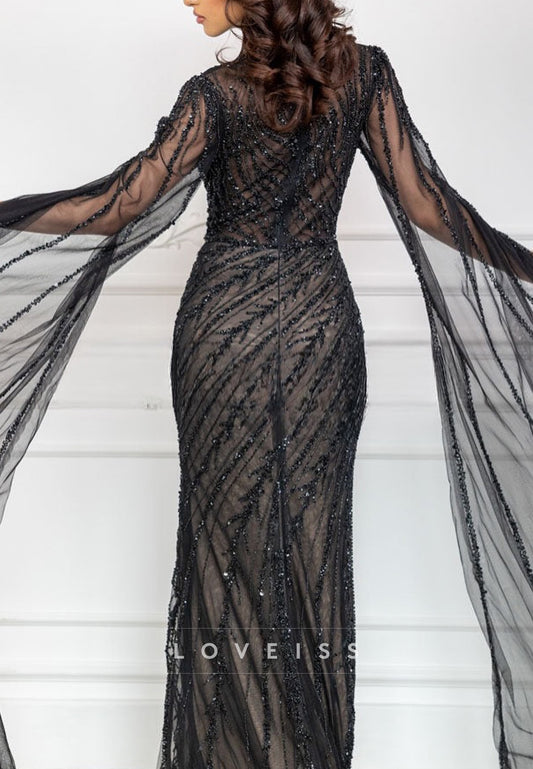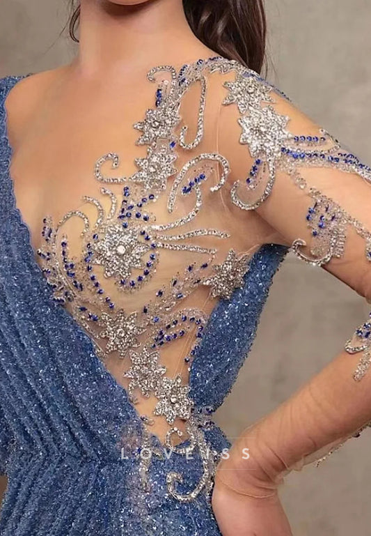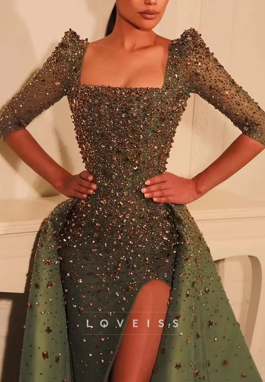 Square Long Sleeves Beaded Sparkly Side Slit Sheath Evening Dress