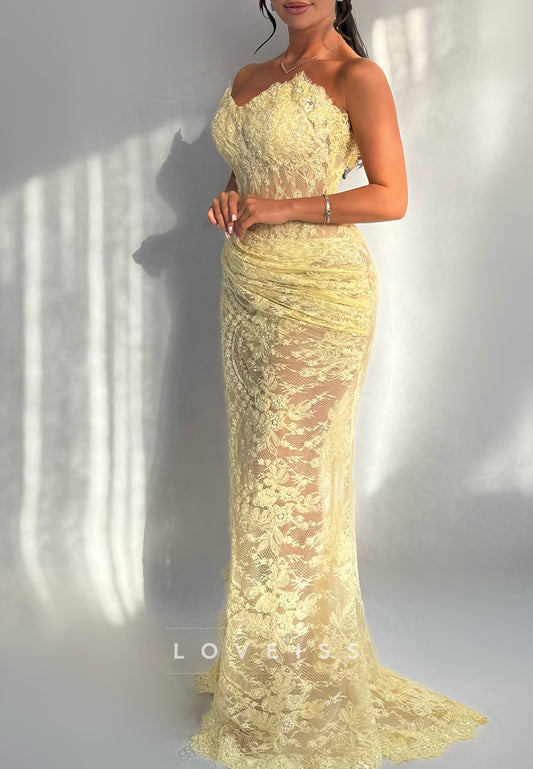 Sweetheart Strapless Lace Appliques Pleated Sheath Prom Dress