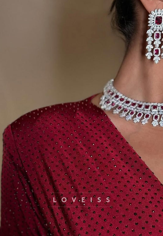V-Neck Long Sleeves Sparkly Ruched Sheath Evening Dress