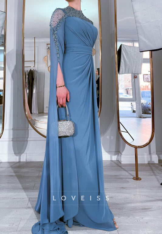 Half High Neck Long Sleeves Beaded Ruched Sheath Mother of Bride Dress