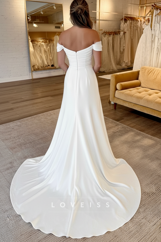 Off-Shoulder Pleated Side Slit Detachable Train Sheath Wedding Dress