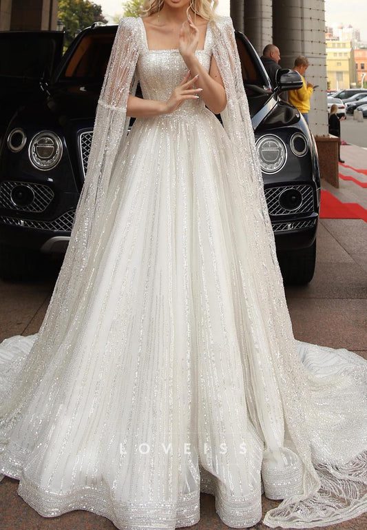 Square Long Sleeves Beaded Embroidery Ball Gown Wedding Dress