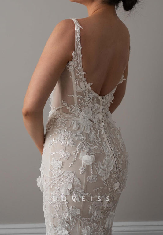 Straight Across Sleeveless Floral Beaded Sheath Wedding Dress