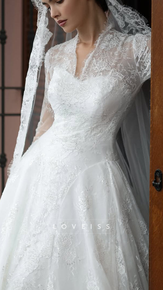 V-Neck Long Sleeves Lace Appliques A-Line Wedding Dress