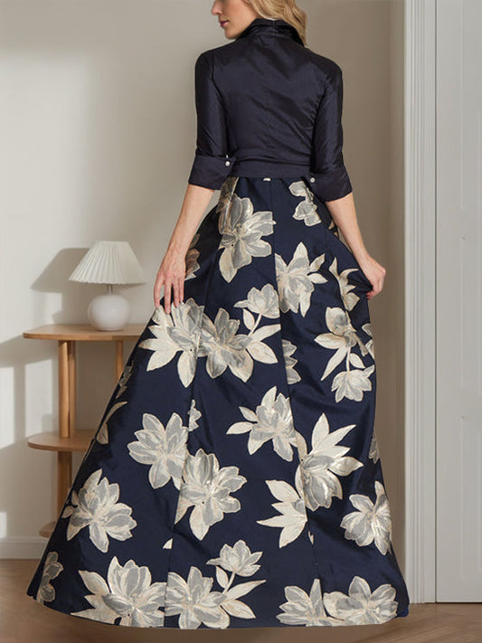 A-Line/Princess Shirt Collar 3/4 Sleeves Floor Length Printed Flower Mother of the Bride Dresses