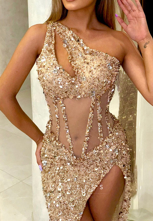 Asymmetrical Sequins Side Slit Sparkly Sheath Prom Dress