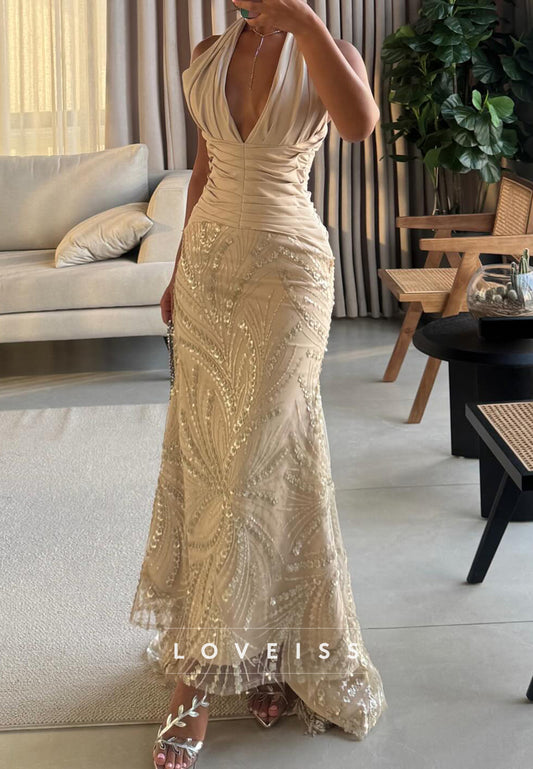 Halter V-Neck Sequins Appliques Mermaid Evening Dress