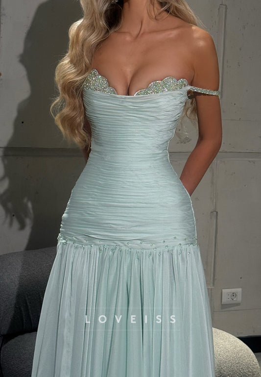 Off-Shoulder Pleated Beaded A-Line Evening Dress
