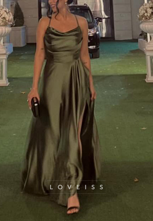 V-Neck Straps Pleated Side Slit A-Line Evening Dress