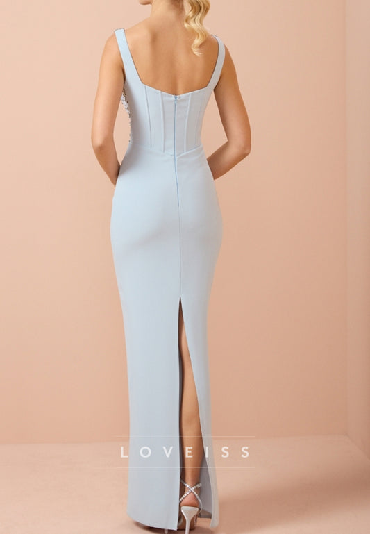 Square Straps Appliques Side Slit Sheath Prom Dress