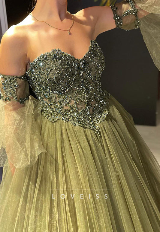 Sweetheart Long Sleeves Tulle Beaded A-Line Prom Dress
