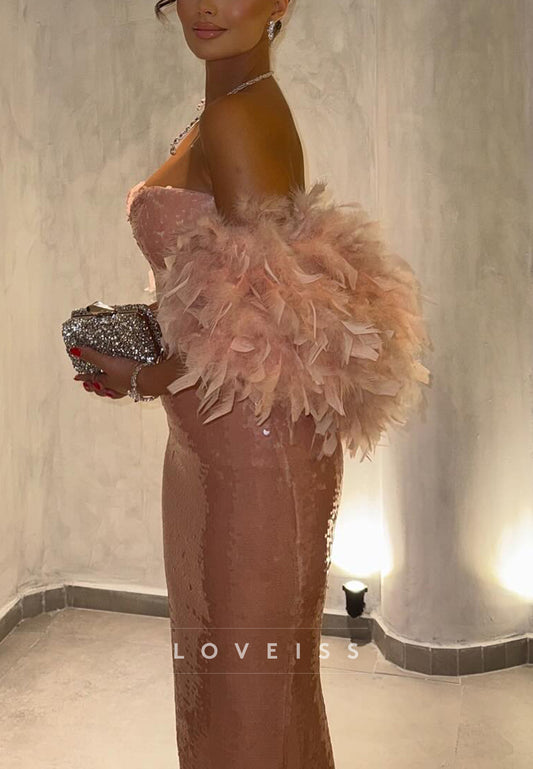 Straight Across Satin Feather Embellished Mermaid Evening Dress