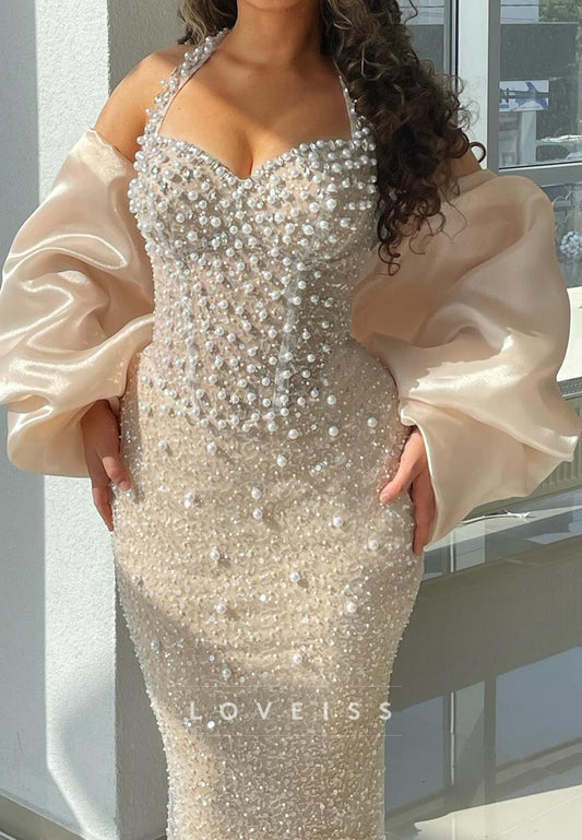 Sweetheart Beaded Long Sleeves Sequins Sparkly Mermaid Evening Dress