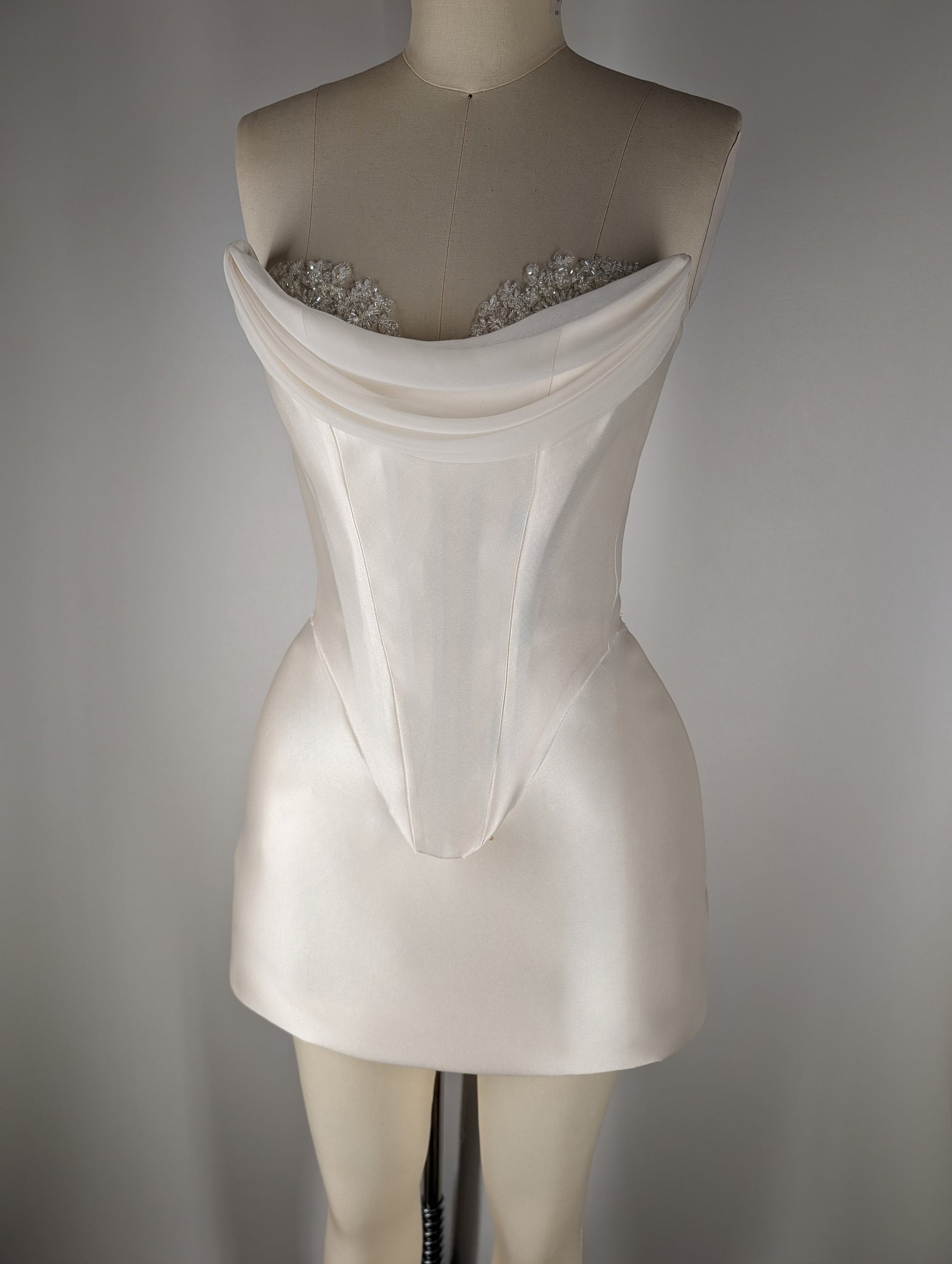 Elevate your elegance with this White Duchess Satin Corset Dress, featuring a draped neckline and intricately beaded lace cups adorned with crystal embroidery. The corset silhouette offers structured support and a flattering fit, while the mini skirt adds a modern, chic touch. Perfect for sophisticated occasions, this dress combines luxurious fabrics and detailed craftsmanship to ensure you stand out with timeless grace.