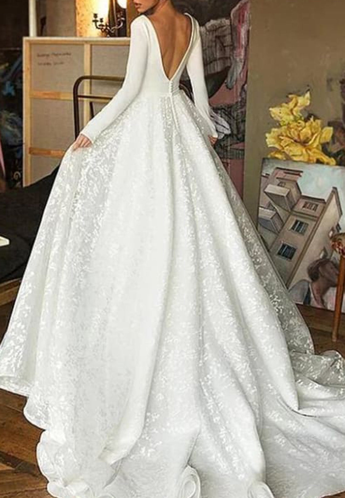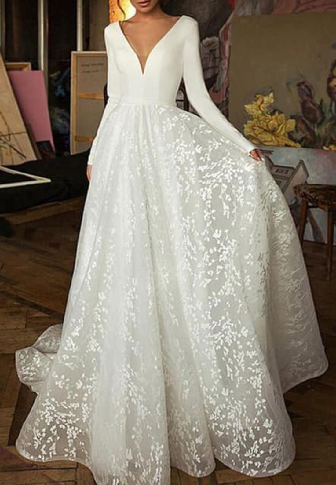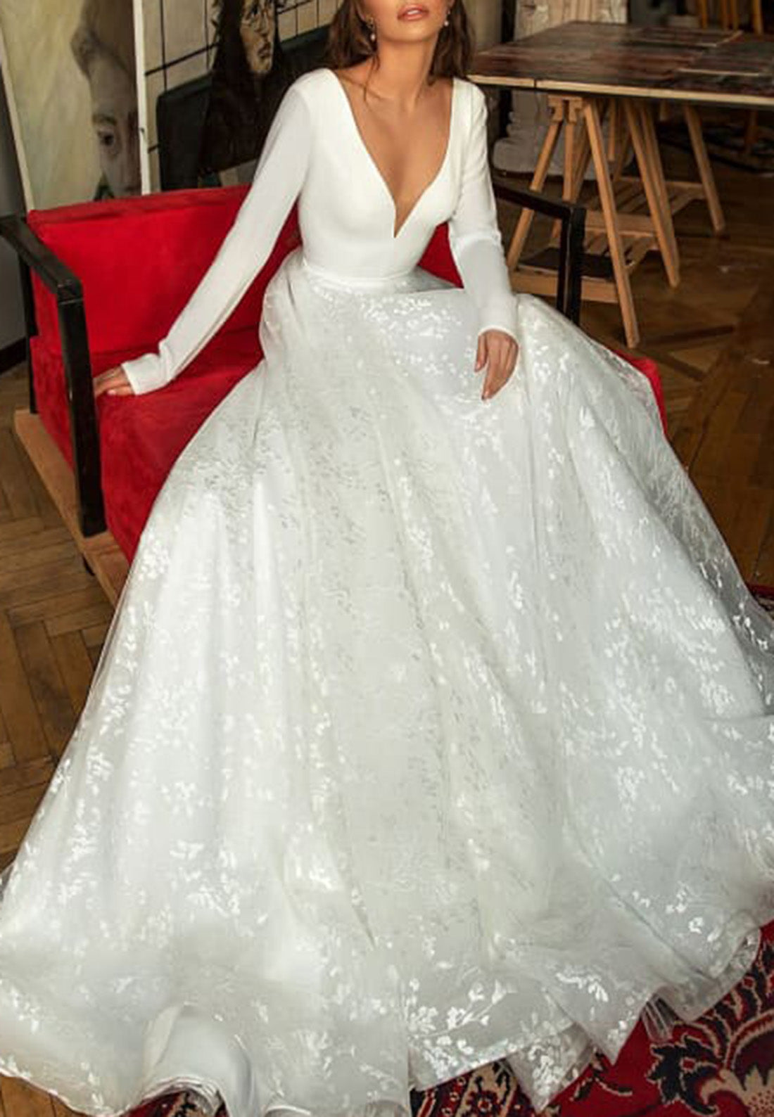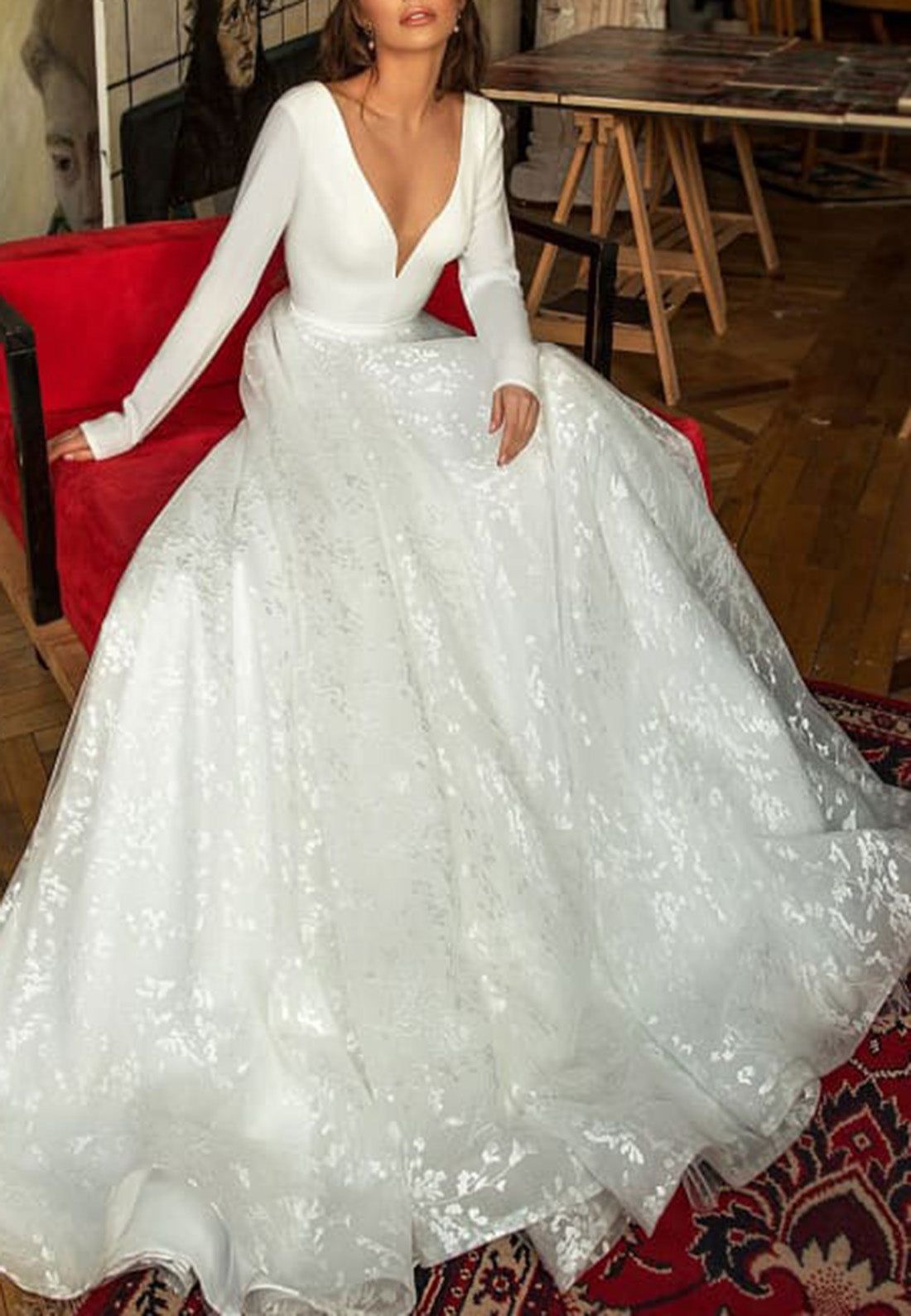 V-Neck Long Sleeves Sparkly A-Line Wedding Dress