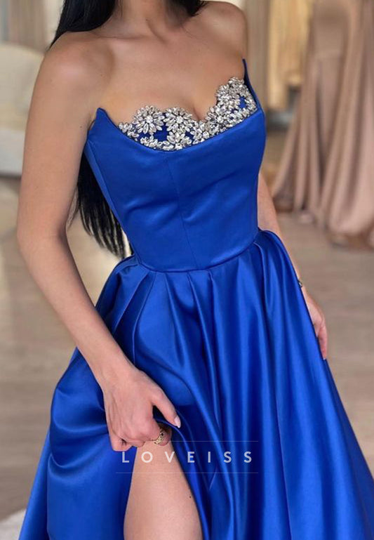 Scoop Strapless Beaded Ruched High Slit Prom Dress