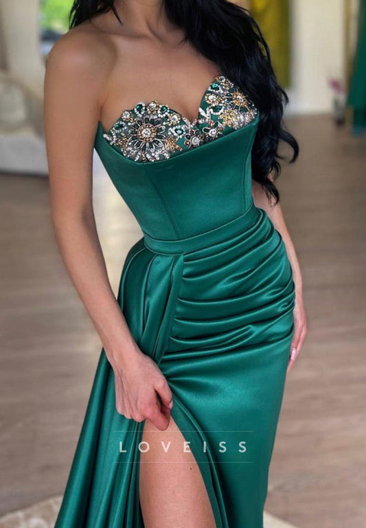 Sweetheart Sleeveless Beaded Ruched High Slit Sheath Prom Dress