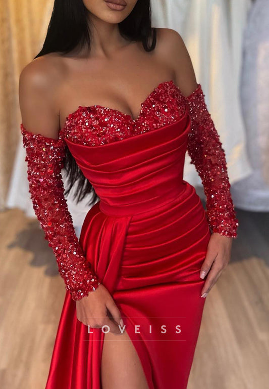 Off-Shoulder Long Sleeves Sequins Ruched High Slit Sheath Prom Dress