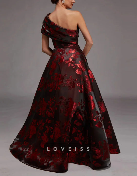Burgundy Satin Floral One Shoulder Maxi Dress