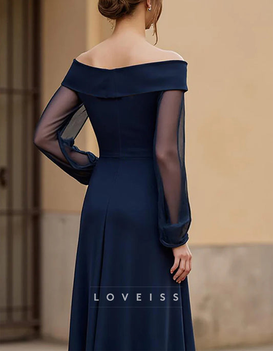 A-line Long Sleeve Off The Shoulder Satin Slit Embroidered Sequins Maxi Dress