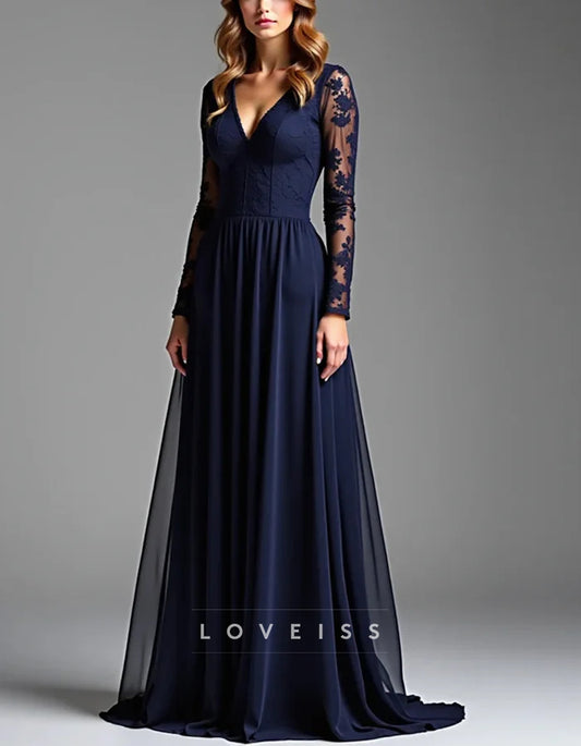Navy Blue Lace-Embroidered V-Neck Evening Gown