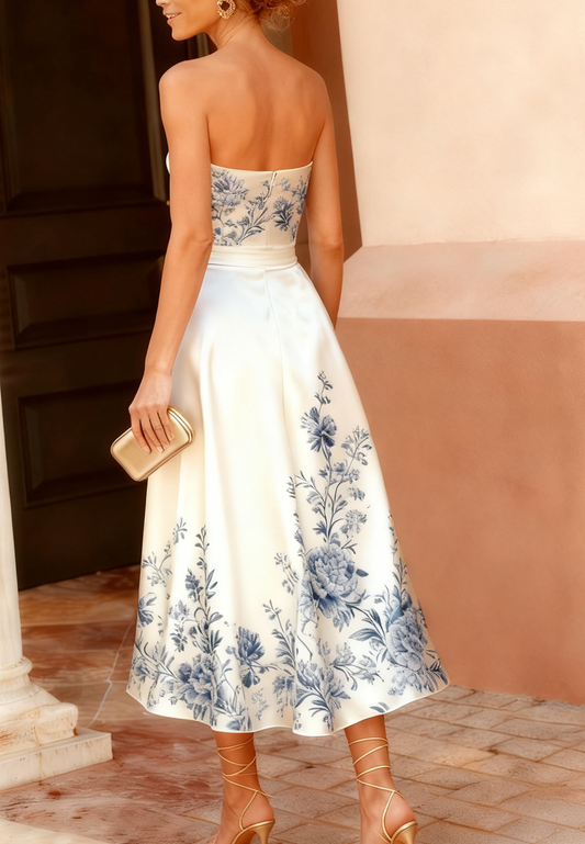 Blue Satin Print Midi Dress