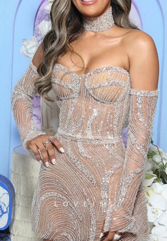 Off-Shoulder Beaded Appliques Sheath Short Party Homecoming Dress