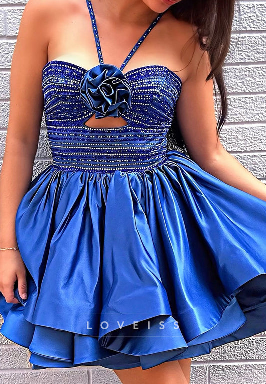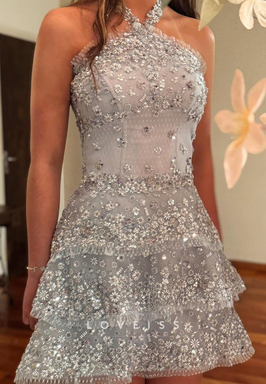 Halter Sleeveless Beaded Sparkly A-Line Short Homecoming Dress