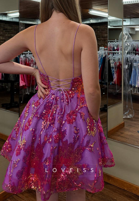 V-Neck Spaghetti Straps Appliques Sequins A-Line Homecoming Dress