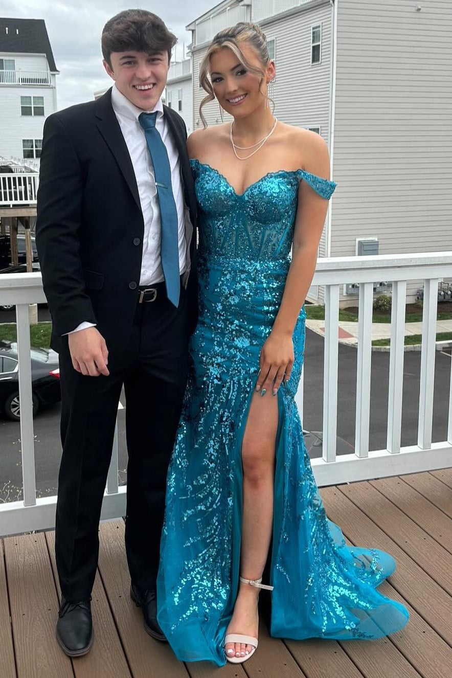 Make a statement in this stunning gold sequin lace mermaid gown. The off-the-shoulder neckline creates an elegant, sophisticated silhouette while the intricate sequin detailing catches light beautifully. A high slit adds movement and modern flair to the classic mermaid cut. Perfect for formal events, galas, or special occasions where you want to command attention with timeless glamour and refined style.