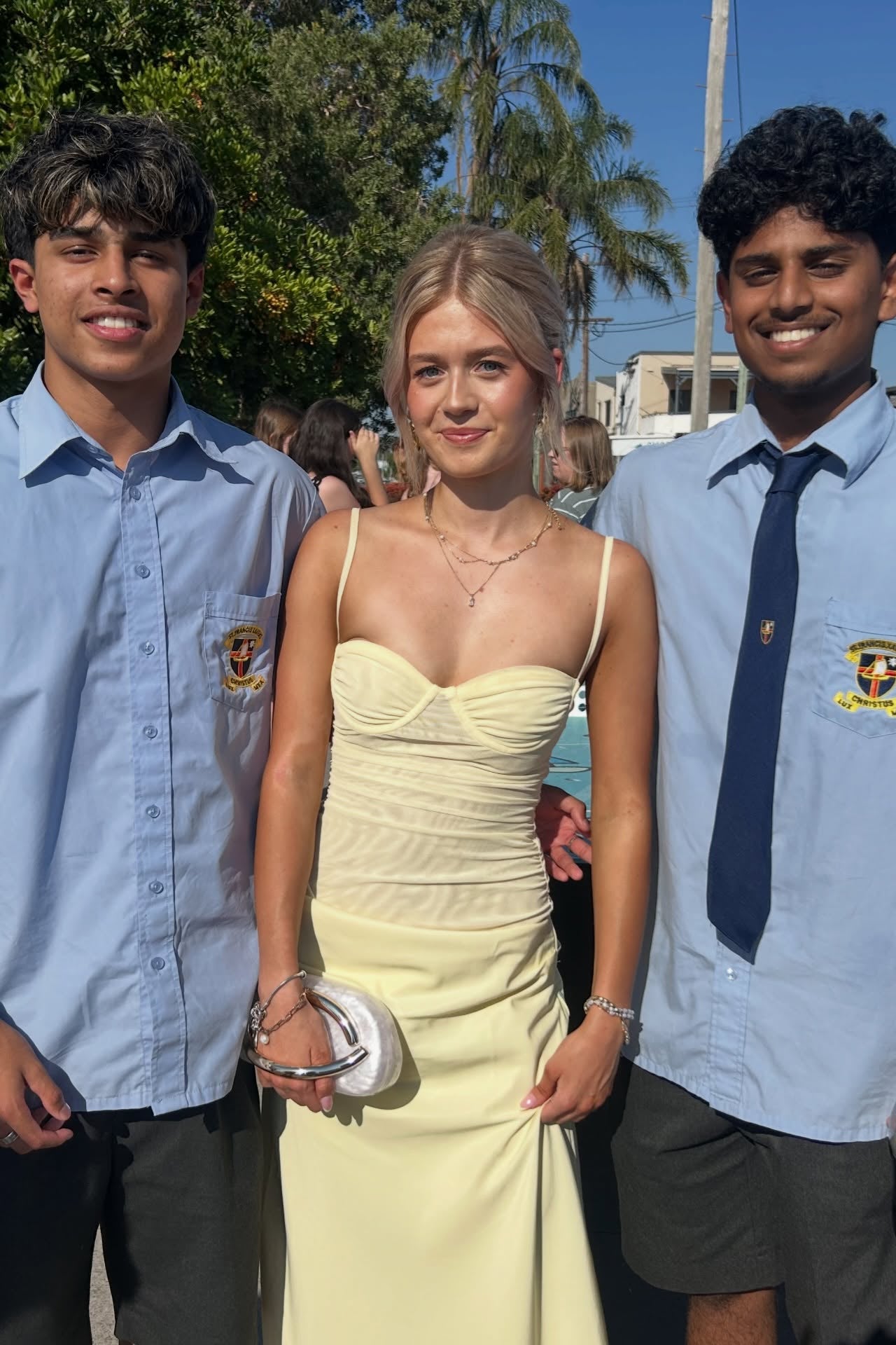Vibrant yellow polyester maxi dress with a sheer mesh bodice and spaghetti straps. The A-line cut features subtle ruching and a convenient side zipper for a polished, versatile silhouette.