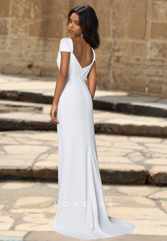 V-Neck Cap Sleeves Ruched High Slit Beach Wedding Dress