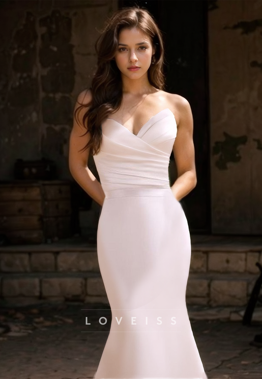 V-Neck Strapless Sleek Satin Pleated A-Line Classic Wedding Dress