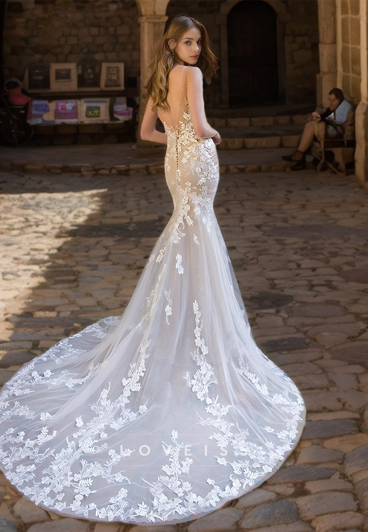 V-Neck Spaghetti Straps Lace Appliques Mermaid Wedding Dress