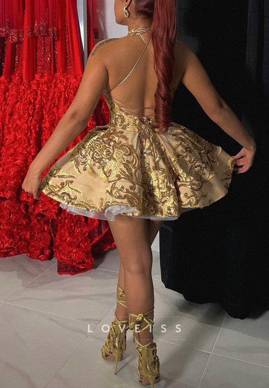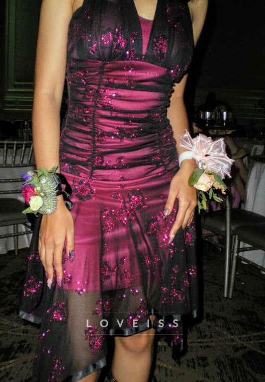 Halter V-Neck Beaded Pleated A-Line Sparkly Party Homecoming Dress