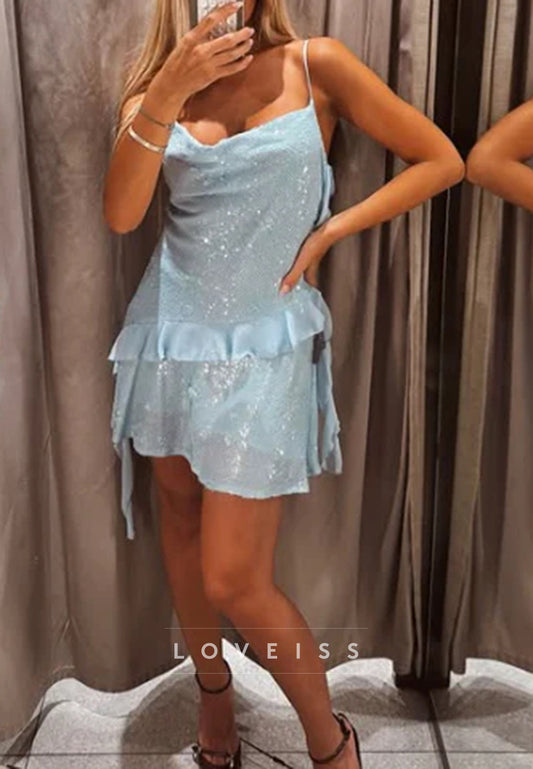 Off-Shoulder Spaghetti Straps Sparkly Short Homecoming Dress