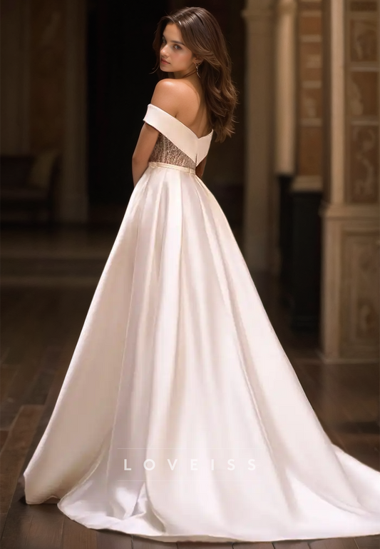 Off-Shoulder Strapless Beaded Pleated Sleek Satin A-Line Wedding Dress