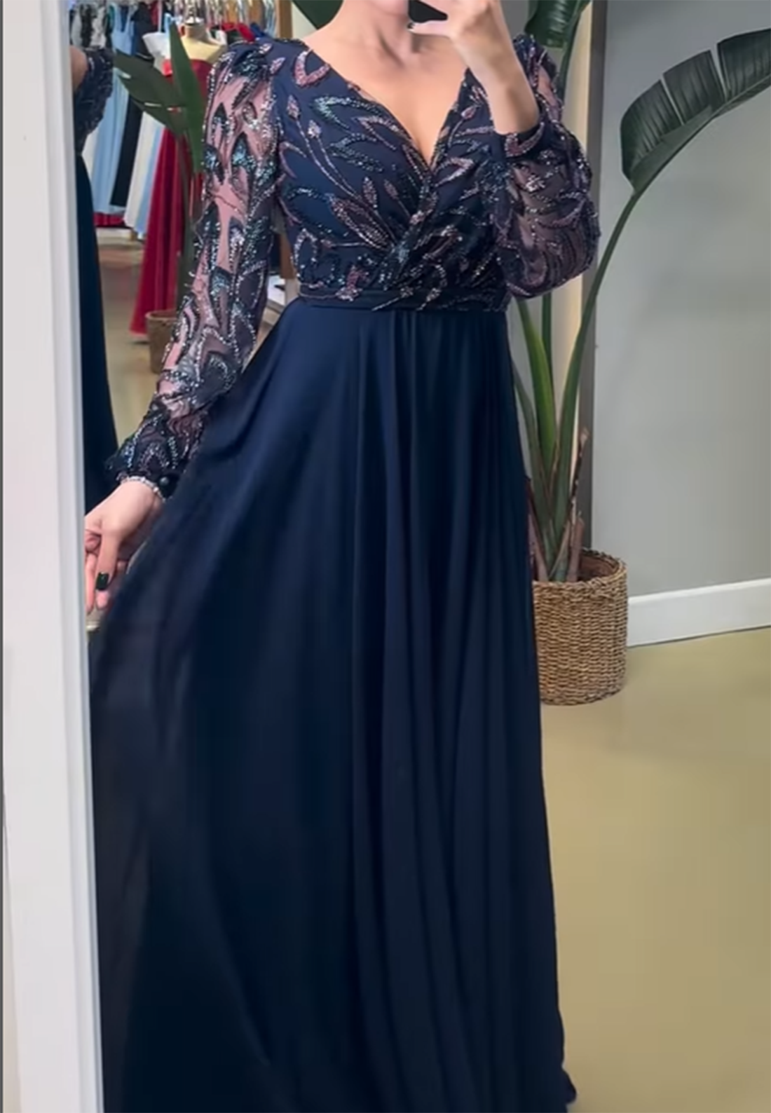 This elegant evening dress features a flattering V-neckline and delicate appliques that add refined texture and visual interest. The long sleeves provide graceful coverage, while the A-line silhouette ensures a timeless, flattering fit for various body types. Perfect for formal occasions, this dress combines classic design with subtle detailing to create a sophisticated and polished look.