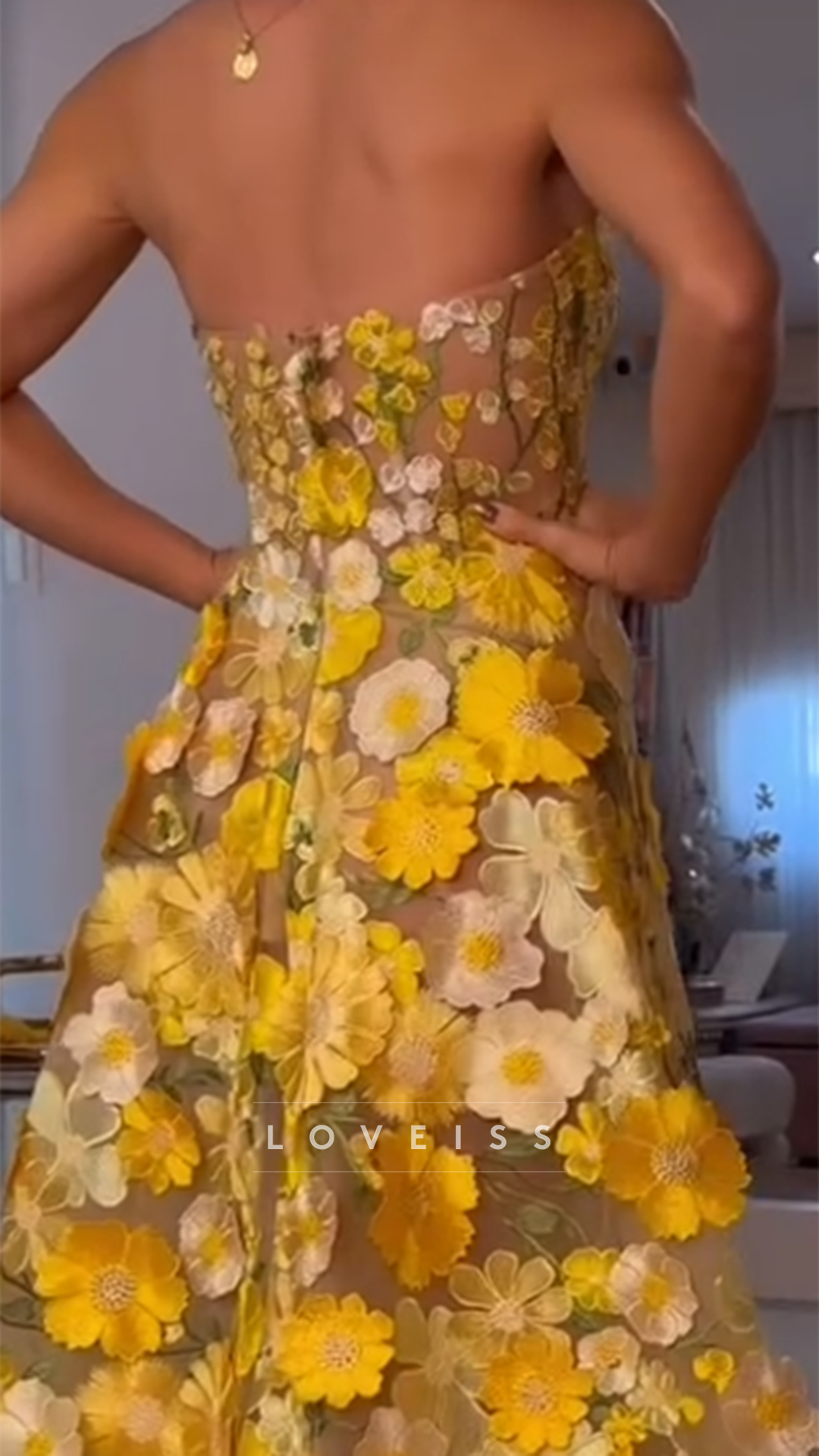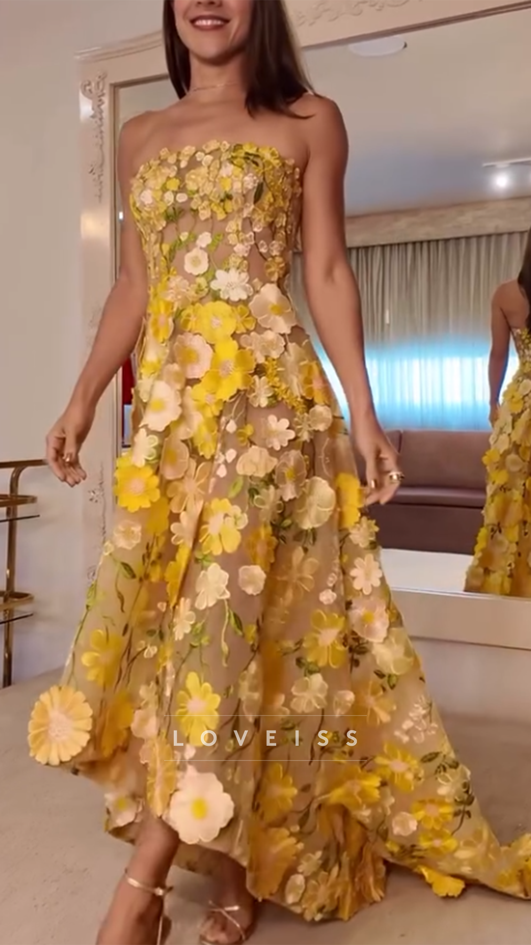 Elegant strapless evening dress featuring delicate floral embellishments throughout. The flattering A-line silhouette creates a graceful, flowing shape that suits most body types. Perfect for weddings, formal events, and special occasions. The strapless neckline offers a sophisticated, timeless look while the intricate floral details add romantic charm and visual interest. Comfortable and stunning, this dress makes a memorable impression at any celebration.