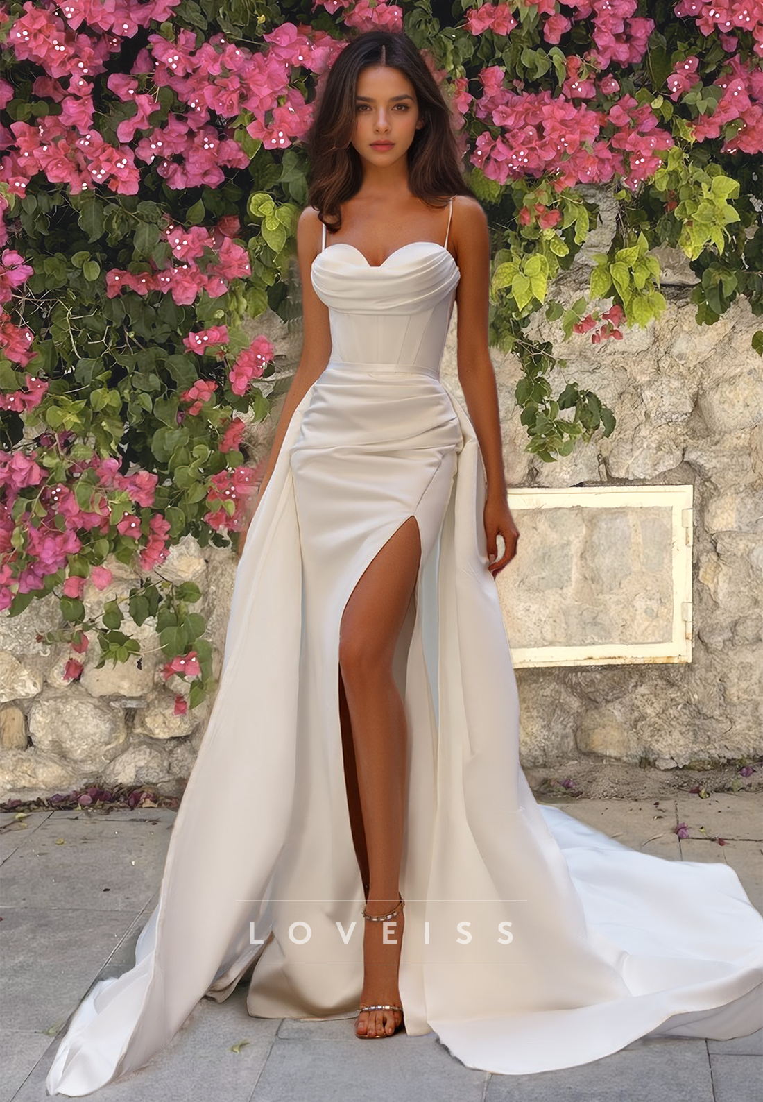 Sweetheart Spaghetti Straps Pleated Side Slit Sleek Sheath Beach Wedding Dress