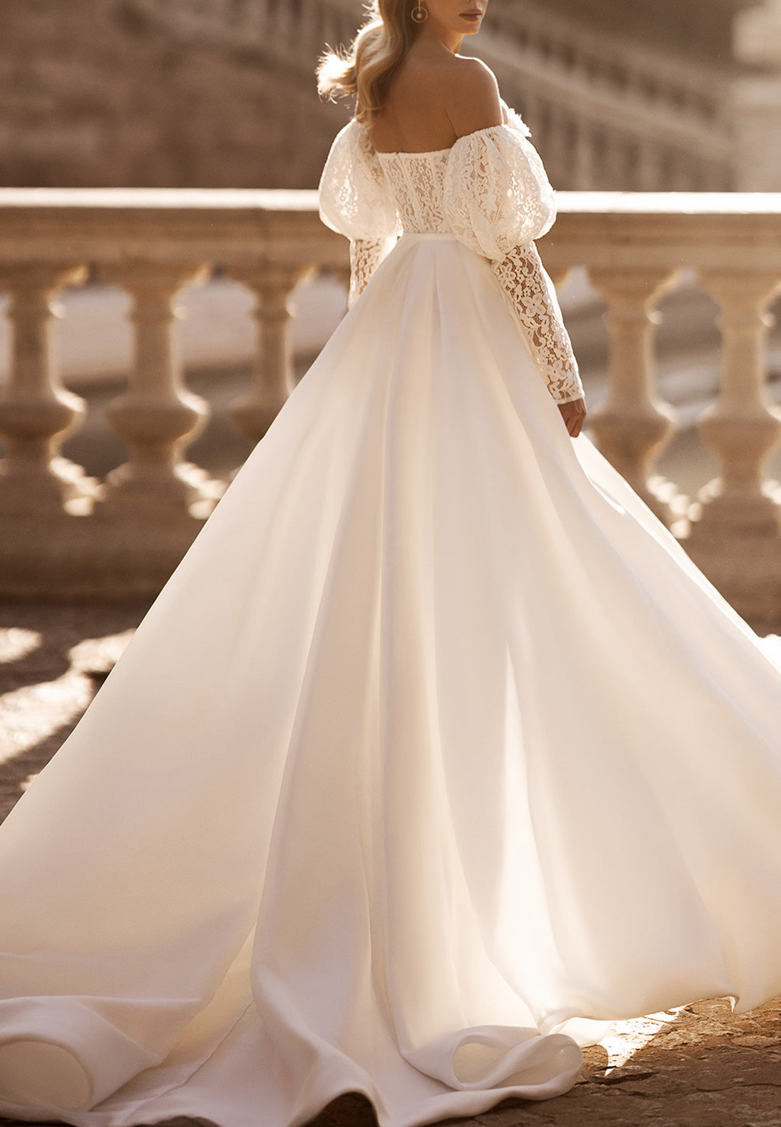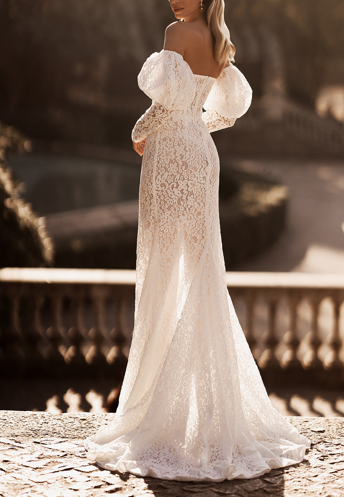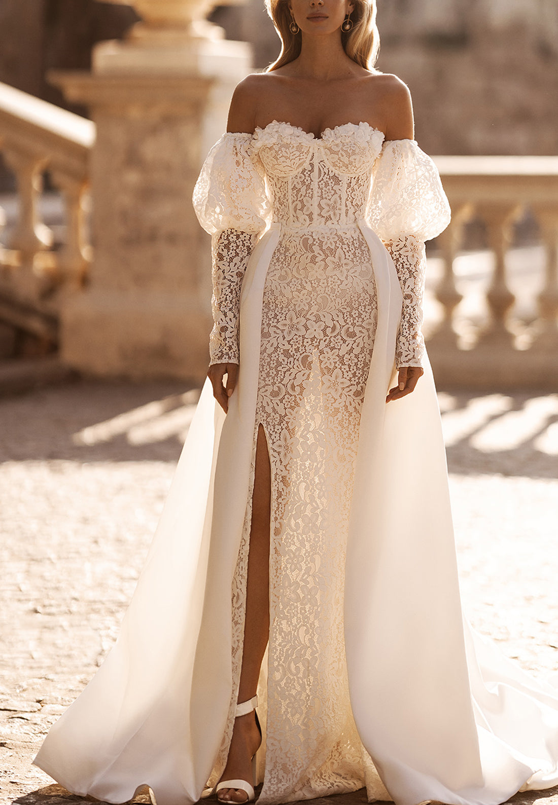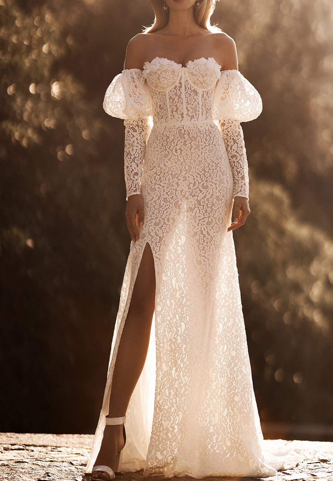 Expertly crafted with a sweetheart neckline, intricate lace appliques and a high slit, this sheath beach wedding dress exudes elegance and sophistication. The long sleeves add a touch of romance, perfect for a dreamy seaside wedding. A stunning choice for any bride seeking a graceful and stylish look.