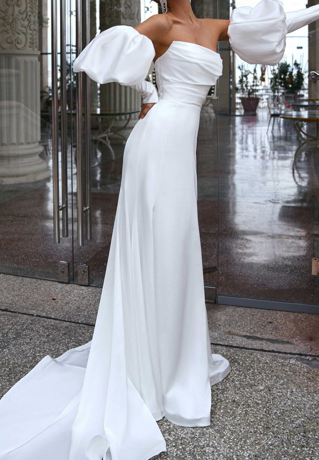 This sleek mermaid beach wedding dress offers an elegant and modern look with off-shoulder puff sleeves and a pleated design. Perfect for a beach wedding, this dress will provide a stunning silhouette and effortless style. Make a statement with this beautiful and sophisticated choice.