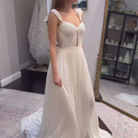 This Sweetheart Straps Pleated Chiffon Side Slit Beach A-Line Wedding Dress combines both elegance and comfort for your special day. Featuring a sweetheart neckline and chiffon fabric, it offers a light and flowy feel perfect for a beach wedding. The side slit adds a touch of glamour while the A-line silhouette flatters all body types. Make your wedding dream come true in this beautiful dress.