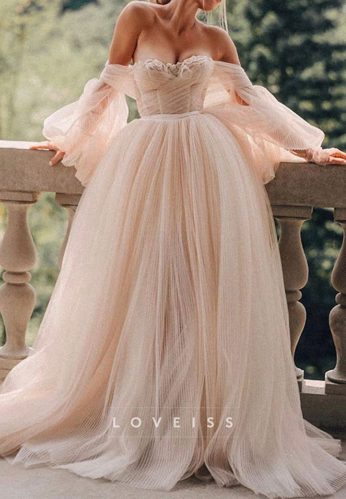 Off-Shoulder Long Sleeves Tulle Pleated A-Line Wedding Dress