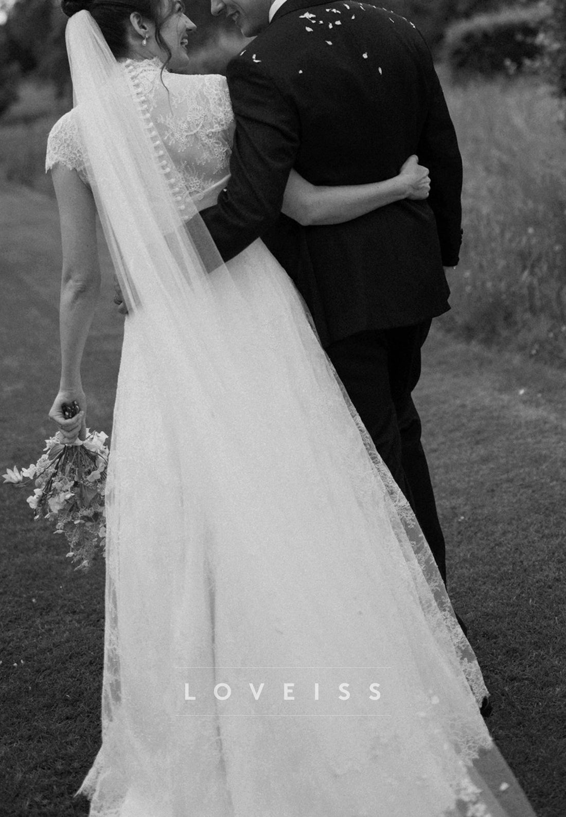 The High Neck Short Sleeves Lace Appliques A-Line Wedding Dress offers a sophisticated and graceful silhouette. Its high neckline and short sleeves provide elegant coverage, while delicate lace appliques add intricate texture and romantic detail. The A-line skirt gently flares from the waist, creating a flattering shape that allows for comfortable movement. This dress is ideal for brides seeking a refined gown that blends classic elegance with timeless craftsmanship.
