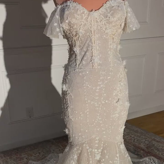 Make a stunning statement in this elegant sleeveless mermaid wedding dress that radiates timeless beauty and confidence. The sweetheart neckline gracefully showcases the shoulders and collarbone, creating a romantic and flattering silhouette. Ornate appliqués embellish the bodice and hips with meticulous artistry, adding dimensional detail and visual sophistication. The sculpted mermaid cut hugs the figure beautifully before flowing into an impressive train, delivering captivating presence and movement. Perfect for the discerning bride seeking a gown that combines classic romance with bold, show-stopping glamour.